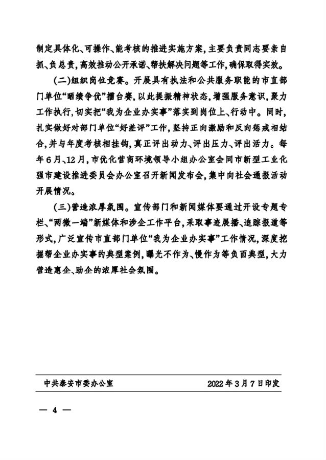 中共泰安市委辦公室泰安市人民政府辦公室印發(fā)關(guān)于開(kāi)展我為企業(yè)辦實(shí)事活動(dòng)的實(shí)施意見(jiàn)的通 知