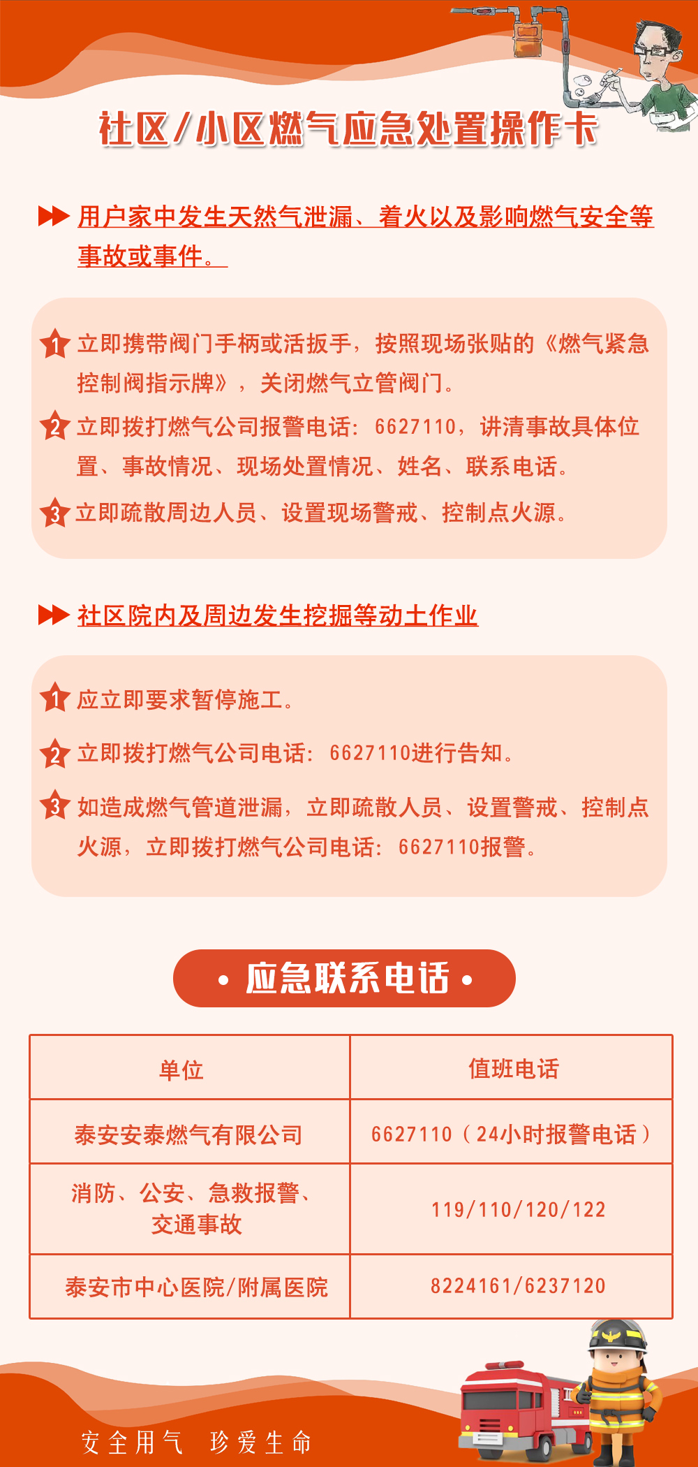 您好,很榮幸為您服務!燃氣安全關系到小區(qū)居民的生命和財產(chǎn)安全,一旦發(fā)生燃氣安全事故,將給居民的生命財產(chǎn)安全造成重大的損失和傷害。為了貴小區(qū)安全使用天然氣,安泰燃氣公司按照國務院《城鎮(zhèn)燃氣管理條例》、《山東省燃氣管理條例》、《城鎮(zhèn)燃氣室內工程施工與質量驗收規(guī)范》、《城鎮(zhèn)燃氣設計規(guī)范》等國家、地方、行業(yè)法律、法規(guī),現(xiàn)就貴小區(qū)燃氣設施安全告知如下: