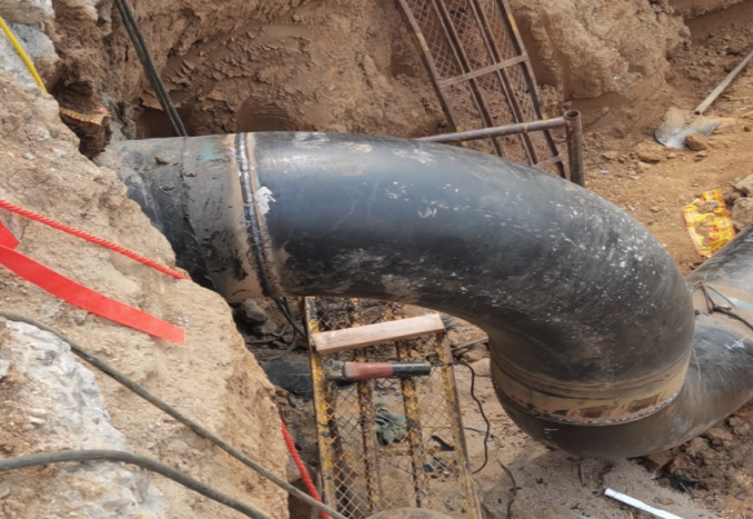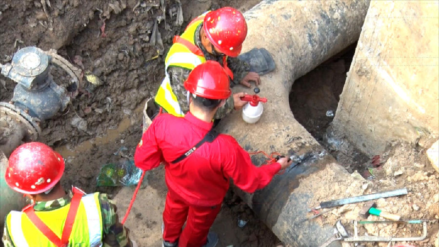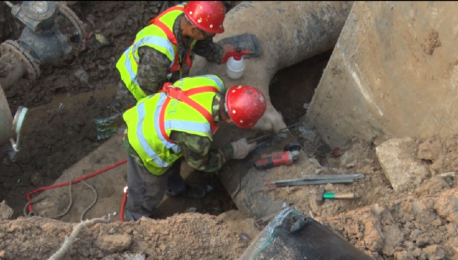 22日9時03分,A、B、C、D、F、G、E作業(yè)點舊管道成功切割完畢。有經(jīng)驗的工人迅速清理掉切割面的雜質(zhì),對新舊管道進(jìn)行對口操作。由于現(xiàn)場施工面積有限,一名工人為了準(zhǔn)確切割管道底部,干脆躺在地上進(jìn)行操作。在他的頭頂,安全帽寫有“安全生產(chǎn)”字樣,在陽光的照射下格外顯眼。