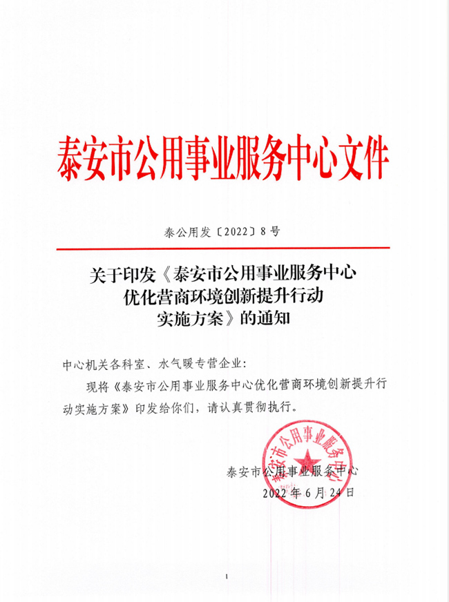 關于印發(fā)《泰安市公用事業(yè)服務中心優(yōu)化營商環(huán)境創(chuàng)新提升行動實施方案》的通知