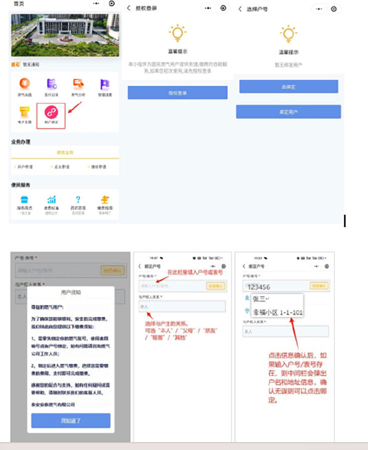 ?  在該頁面填入正確的戶號或表號信息(表號可于家中燃氣表上找到),點擊“信息確認”,如果戶號或表號信息填寫準確,會彈出戶名和住址信息,確認無誤后點擊下方的綁定。