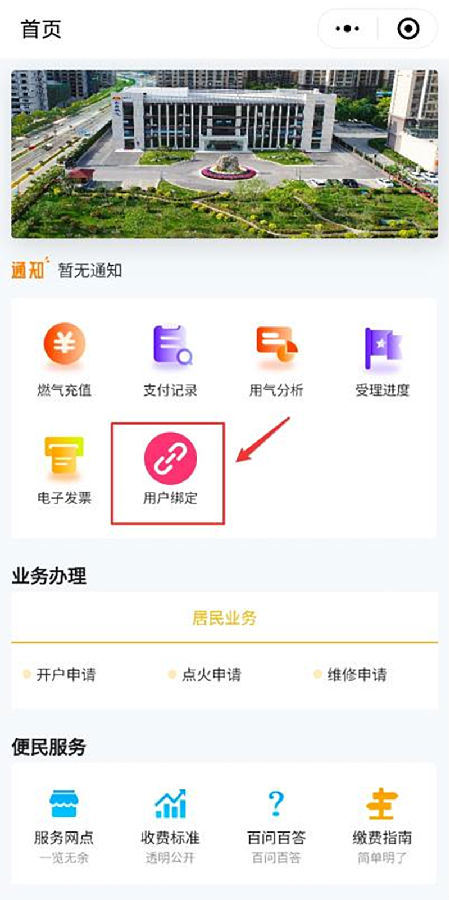 ?  全部綁定完成后,點擊首頁的“用戶綁定”可查看并切換當前登錄的燃氣賬戶。